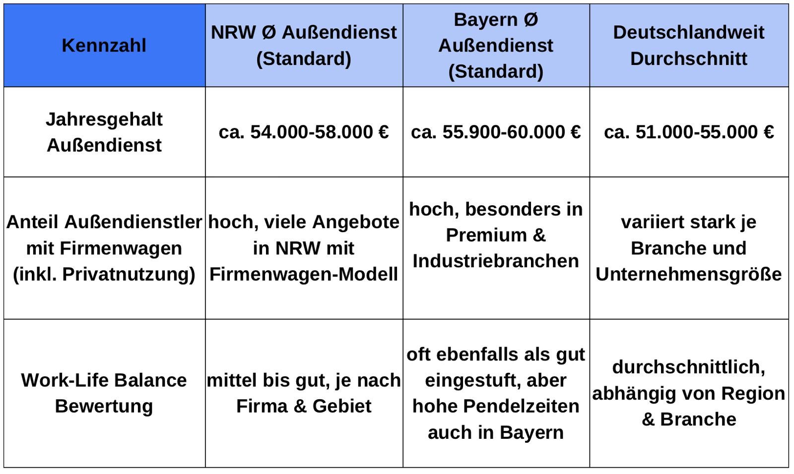 ✅ Gebietsgröße / Pendelaufwand: NRW ist groß, aber kompakter als Bayern. Wenn dein Gebiet viele Kilometer oder viele Termine umfasst, kann das auch im Gehalt reflektiert sein (z. B. über Reisekosten, Firmenwagen, Zuschläge).