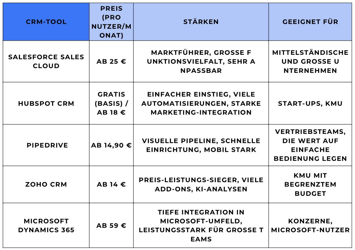 Für kleine Teams eignen sich vor allem HubSpot, Pipedrive oder Zoho CRM – schnell implementiert und kostengünstig.